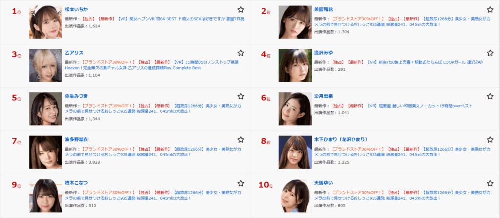 ※この画像は、FANZA公式サイトに掲載されていた月間AV女優ランキング1位から10位を参考資料として掲載しています。(100位までの画像はキャプチャしておりますが、著作権の観点から全ての掲載はしていません。)